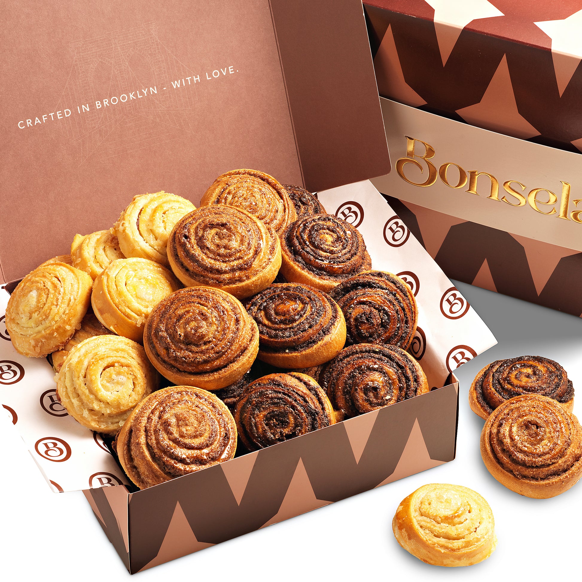 MAKE LIFE SWEETER WITH BONSELA - Full of classic favorites, it's a cookie lover's dream in every bite! Enjoy this gourmet kosher, fresh baked cinnamon rolls that includes 20 Large Pieces of Flavorful Buns and wrapped in an elegant Gift Box.